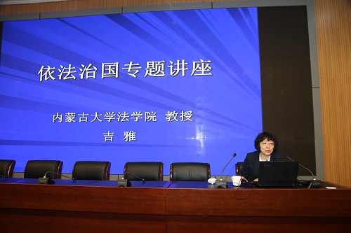此次讲座特邀内蒙古大学法学院教授、硕士研究生导师吉雅,为全馆干部职工讲授了以依法治国为主题的专题讲座。吉雅教授利用法制的涵义为切入点,理论结合实践地讲解了我国建设依法治国的目标和要求、依法治国建设的任务和全面推进依法治国决定的亮点三大方面。讲解过程中,吉雅教授以生动风趣的语言介绍了我国以宪法为核心的法律规范体系和依法行政,建设法治政府的主要内容,并结合生活中典型案例全面透彻地分析了我国全面推进依法治国决定的八大亮点。