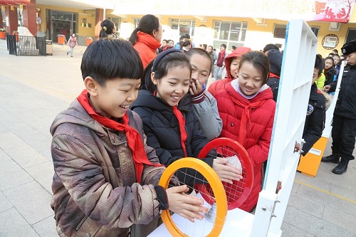活动现场同学们围在科普展品前,兴致勃勃的体验了“天鹅绒触觉”、“懒惰环”、“旋转的银弹”、“无弦琴”等17件科普展品,让孩子们在互动体验中感受到了科学带来的快乐和科普展品的神奇魅力。