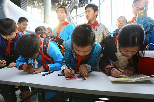 活动刚开始,在数字立体巨幕影院一层入口处,民族实验学校的学生们认真写下保护环境的宣言以及对地球母亲深深的祝福,并且庄重地签上了自己的名字。这些宣言既有蒙文也有汉文,字迹工整,错落有致贴在了展板上。