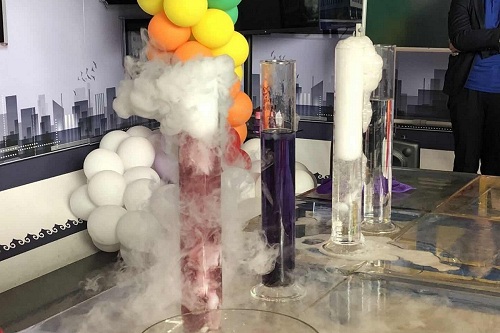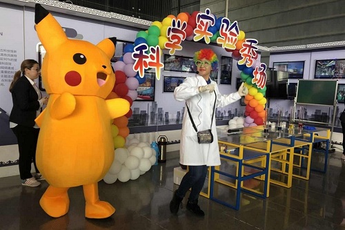 下午的科学实验秀以“科学的色彩”为主题,毛毛博士和她的助手比卡丘进行了“大象牙膏”、“茶水变色”、“水中取沙”、“酸碱变色”、“干冰吹泡泡”等一系列有趣又多彩梦幻的实验,并且通过实验,向小朋友和家长们解释了实验的科学原理。