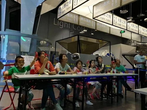 本次活动现场招募10组家庭,观众在科技辅导员的指导下,首先体验展品,进入了主题。现场展品展示为沿着莫比乌斯带的面安装LED屏,LED屏上出现很多“彩色豆子”的形状,屏中模拟演示一个卡通形象的大嘴巴一个个吃掉LED屏上的豆子,“贪吃蛇”经过莫比乌斯带的所有面不停地循环往复着。展品使用先进的电子技术手段,向观众形象地展示莫比乌斯带的形成,能使观众直观的了解莫比乌斯带只有一个面和一条边的特性,从而激发观众的探索欲和求知欲。