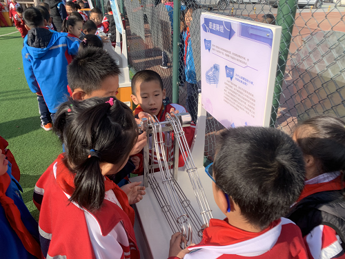 内蒙古科技馆的科技辅导员们为海西路小学学生带来了多件互动展品,其中包括“窥视无穷”、“旋转的银蛋”、“静电乒乓”、“听话的小球”和“椎体上滚”等经典展品。同学们有的在认真阅读展板上的科学知识,有的兴奋地进行操作体验,还有的相互讨论其中蕴含的科学道理,大家在体验中体会科技的神奇,感受科技带来的快乐。