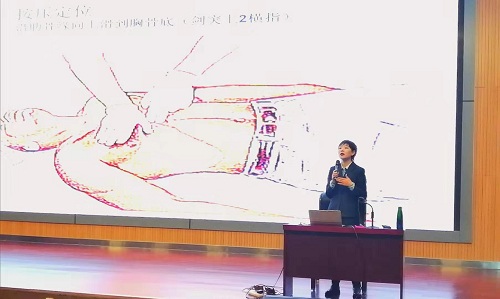 讲座中,麻雪静介绍了心肺复苏术相关知识,并用大量图片视频演示动作要领。随后介绍了“三减三健”的健康生活方式,列举了环境污染、室内污染的危害及防护知识。同时,麻雪静结合中医针灸、电磁疗等医疗理疗手段,就“三高”问题及肩、颈、腰等常见职业病的预防和治疗展开讲解,并现场带领职工学习如何找准经络穴位。
