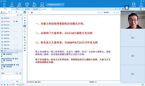 发布时间:2020-03-13 17:25 文章来源:内蒙古科技馆3月13日,内蒙古科技馆举办了第五期在线业务培训班,邀请呼和浩特市天文爱好者协会秘书长刘庚,结合内蒙古科技馆球幕影院科普资源,讲解了如何结合天文天象热点开展科普活动。自治区、盟市、旗县(市、区)科技馆等科普场馆的科技辅导员及相关工作人员共150人通过电脑或手机参加了培训。