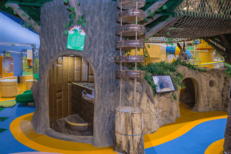 本展项由三棵仿真大树、树与树之间连接的各种绳索、仿真藤条和树干构成了各种连接的通道及活动平台,向观众展示树的组成部位及树皮的相关知识,加深观众对树的认识。展项主体由三棵大树组成,树干上方各有一个平台,其中两颗树干下方设有洞口,树干内有盘旋楼梯、爬格,观众可以从树洞进入树干内,通过盘旋楼梯、爬格、爬网到达树干上方的平台。在平台上观察大树的树干、树枝、树叶和树冠等,还可以通过吊桥在树屋之间走动。大树下方还有可拉动的不同抽板,启动上方的显示器,显示器里就显示相关的树皮知识。观众在三颗树上搭建的平台进行攀爬走动,需要调动全身的各个部位协调运作,需要手、脚、眼及身体的综合配合。随着攀爬距离和高度的不断变化,每攀到一个新的地方,都会给观众的视觉带来新的体验。