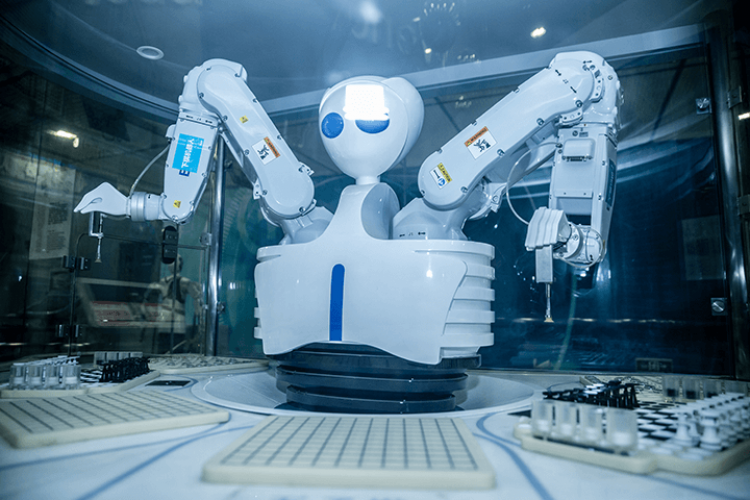 本展品主要由工业机械臂、互动触摸屏、收棋系统等组成。比赛过程中,机器人可以同时与六名观众进行三种棋的互动对弈,您可以通过互动触摸屏与机器人下棋,机器人通过气动装置在真实棋盘中为观众摆放棋子并走棋。期间,机器人会使用幽默的语言与观众互动,比赛结束后,机器人会宣布比赛结果并将棋盘恢复。人类外形的机器人面前一百八十度以内有六盘棋,机器人两条手臂各控制三盘,与观众进行同时对弈。展品集机械电子、图像识别、博弈算法、快速运动控制等多种学科于一体,展示机器人的智能逻辑判断博弈能力、机器人的快速反应和灵活运动能力、机器人的高速运动和定位能力等等。