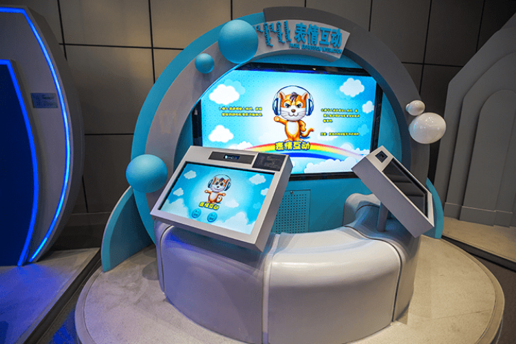 各位观众请看这件展品,大家一定很熟悉手机中的一款app叫会说话的汤姆猫,可爱的小猫可以模仿手机对面的你的各种语言,那在我们这个展项面前只能算是小巫见大巫了,我们的展品利用先进的视频运动捕捉技术,参与者可以使画面人物实现微笑、点头、生气、摇头、张嘴以及闭眼等动作,这种技术可在真人互动游戏制作、虚拟角色的动画制作等领域中应用。电视大屏幕具备演示功能,演示表情互动单人模式和双人模式的效果,所搭载的摄像头可实时抓取参与者的表情,将抓取的人物表情与卡通人物进行结合,还可配合语音采集功能,采集声音,进行升降调处理,形成趣味配音,观众可以在本展品中,体验一下作演员的感觉。