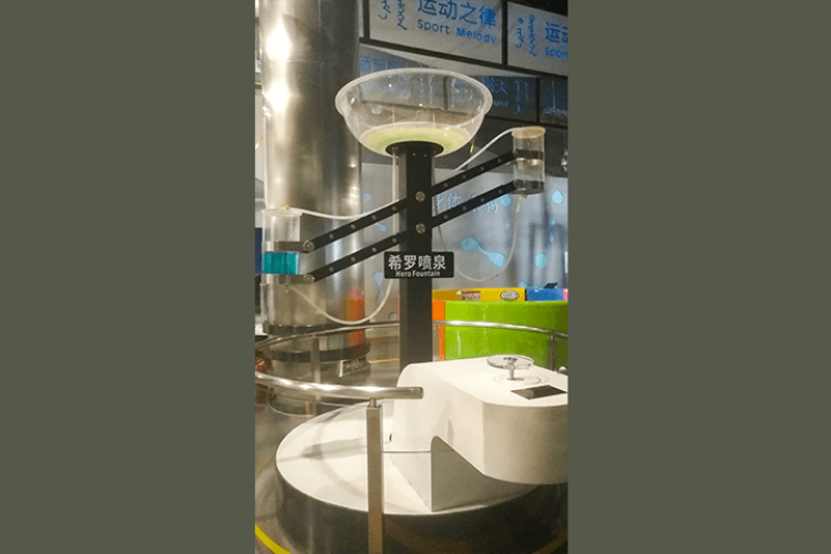 希罗喷泉由三个容器组成,上面的无盖的碟子,下面两个密闭的圆筒。三个容器用三根管子连接起来,利用密闭储水罐之间不同的气压差,无需人工调节即可构成有一定强度的喷泉。您可以通过调节展项,观察效果的改变从而了解大气压强的基本概念,了解希罗喷泉的工作原理。