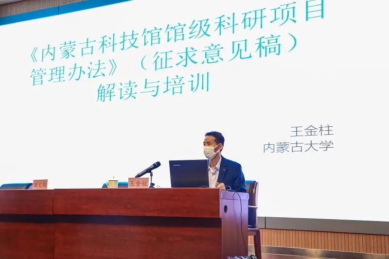 培训中,王金柱结合内蒙古科技馆实际,解读了《内蒙古科技馆馆级科研项目管理规范(征求意见稿)》,重点讲解了项目发起、项目类型、申报条件、评审流程等方面,并通过案例介绍了《内蒙古科技馆馆级项目申报书》的填写规范和科研报告的撰写。王金柱的讲座条理清晰,深入浅出,资料丰富,可操作性强。他建议,做课题研究要从实践中来,结合日常工作,在科普、教育、管理、文创开发、活动策划等方面开展创新性的理论研究和实践应用。在选题过程中,题目忌过大、过难,研究角度和内容越具体越好。