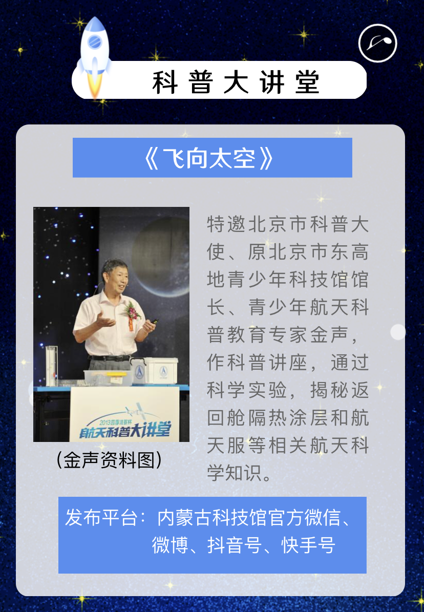 内蒙古科技馆邀请北京市科普大使、原北京市东高地青少年科技馆馆长、钱学森青少年航天科学院专家、青少年航天科普教育专家金声教授,以“飞向太空”为题举办线上科普大讲堂。金声在讲座中穿插了多个简单易行的小实验,深入浅出地讲解了飞船和宇航员在太空会遇到的隔热、失重等问题,让大家直观感受到航天的魅力,激发了大家对探索太空的兴趣。