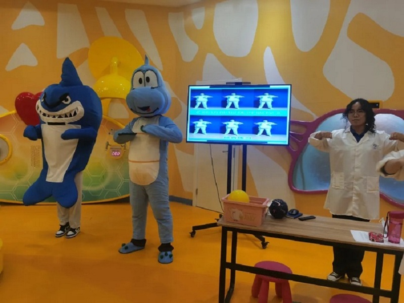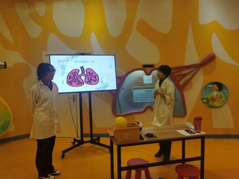 《肺与呼吸》主题科普教育活动内容集趣味性、实践性、互动性和参与性为一体。在内蒙古科技馆儿童科技园认识自己展区,科技辅导员斯琴与贾萍由找到内脏器官位置的游戏开启了教育活动。为了让观众更加直观地认识肺部,她们结合展厅内的“解剖课”“吹出大泡泡”等展品,为大家介绍了肺与呼吸的相关知识。在现场实验教学环节,身着卡通人偶服的科技辅导员扮演成小动物,配合两位授课教师进行了游戏式互动,让整个科普教育活动充满了探究乐趣。