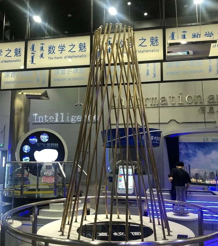 直纹面这件展品由最中间的自动演示模型和周围的三个小模型组成,观众可以通过动手操作和直观观看的方式了解各类直纹面的特征。