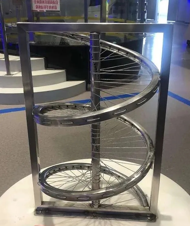从上向下看时,正螺面模型的形状像极了海螺壳上的花纹,这也是它名字的由来。通过观察我们可以看到它是由一条直线围绕着与其垂直的另一条直线不断运动而形成的轨迹。在日常生活中,我们会发现,旋转楼梯就是正螺面的结构,不仅造型美观而且占地面积小,所以被广泛应用于日常生活中。