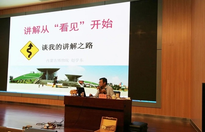 此次培训邀请了内蒙古博物院资深讲解员、呼和浩特市儿童探索博物馆理事、呼和浩特市第二中学特聘教师赵学东,以《讲解从看见开始》为主题做了讲座。赵学东结合自身多年从事展厅讲解及科学教育研究工作的感悟以及讲解艺术“真善美”两个方面作了阐述。