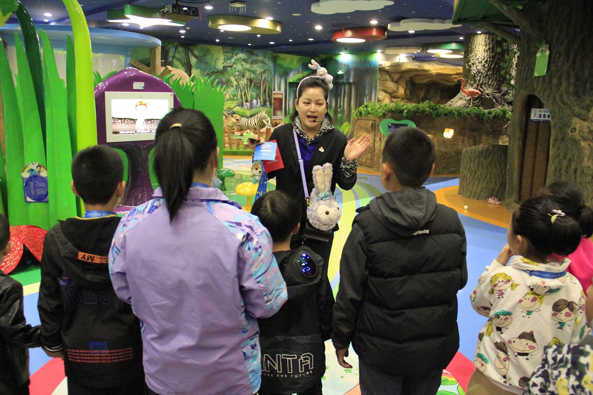 小朋友们来到儿童科技园展厅中的“童话王国”“戏水港湾”“智慧之城”“认识自己”等展区,发现科学知识,寻宝探秘。随后大家观看了情景剧《菜青虫智斗大公鸡》,并在工作人员的示范下,孩子们扮演了剧中角色。通过互动参与,大家了解了蝴蝶的形态和虫变蝶的生长进化过程,进一步增强了小朋友热爱大自然、保护大自然的情感。