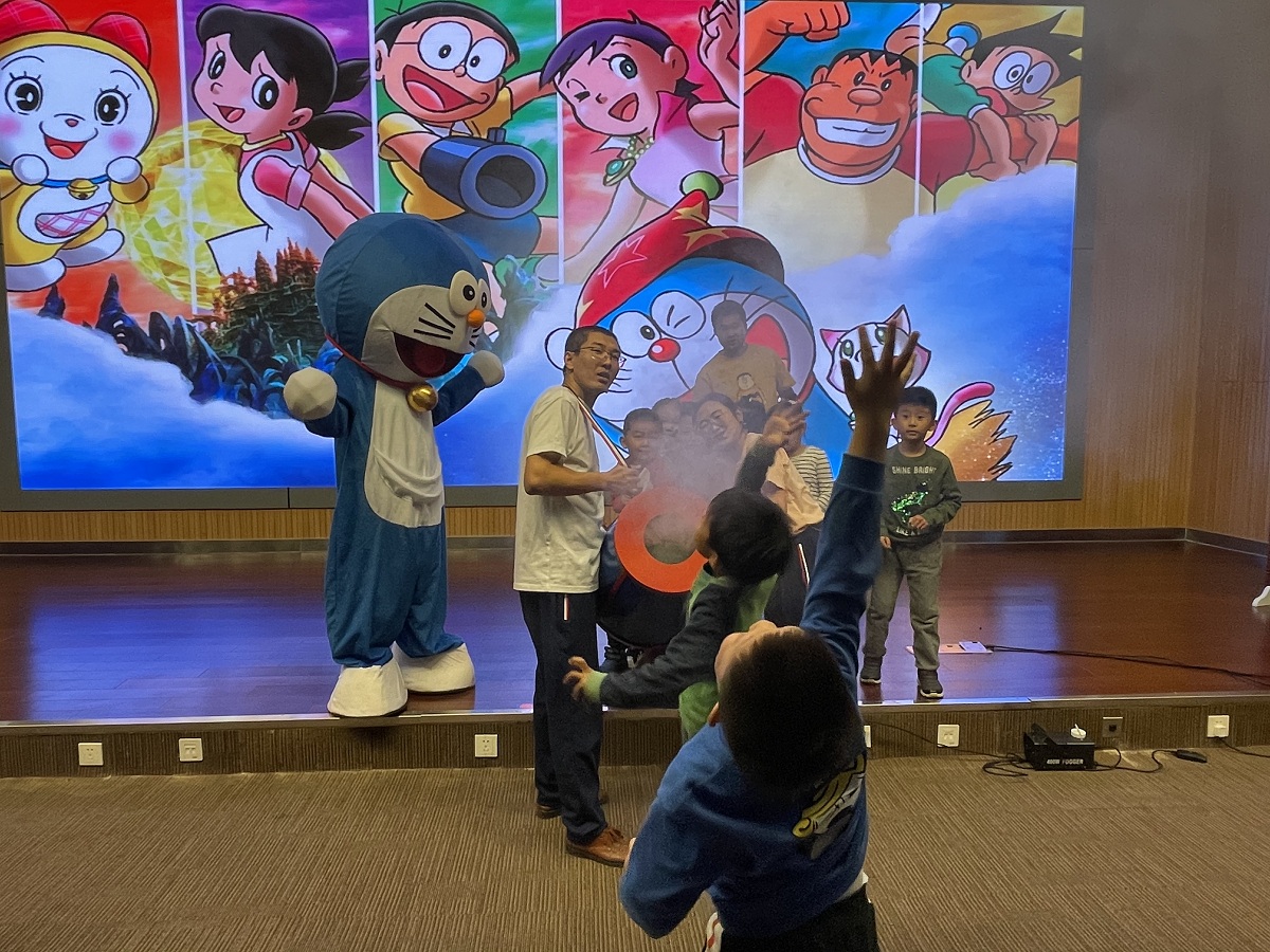 在科普报告厅,大家刚刚落座,只听“嘭”一声响,原来是大雄和胖虎在放空气炮,这样独特的欢迎仪式,让“探秘者们”惊喜不已。科学实验秀“空气炮”利用涡环原理产生空气炮,带领亲子家庭了解神秘的流体力学。