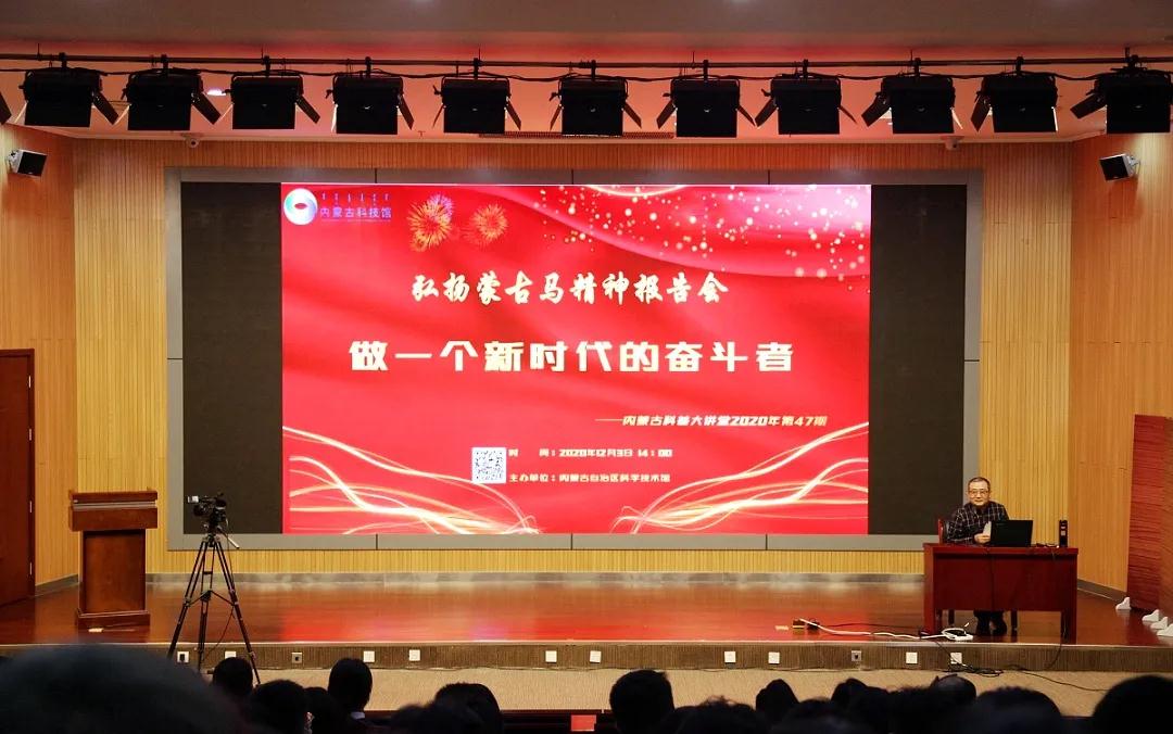 12月3日,第47期内蒙古科普大讲堂“弘扬蒙古马精神——做一个新时代的奋斗者”在内蒙古科技馆报告厅举办。内蒙古科协机关及事业单位党员干部、内蒙古工业大学理学院师生代表近200人现场聆听了讲座。