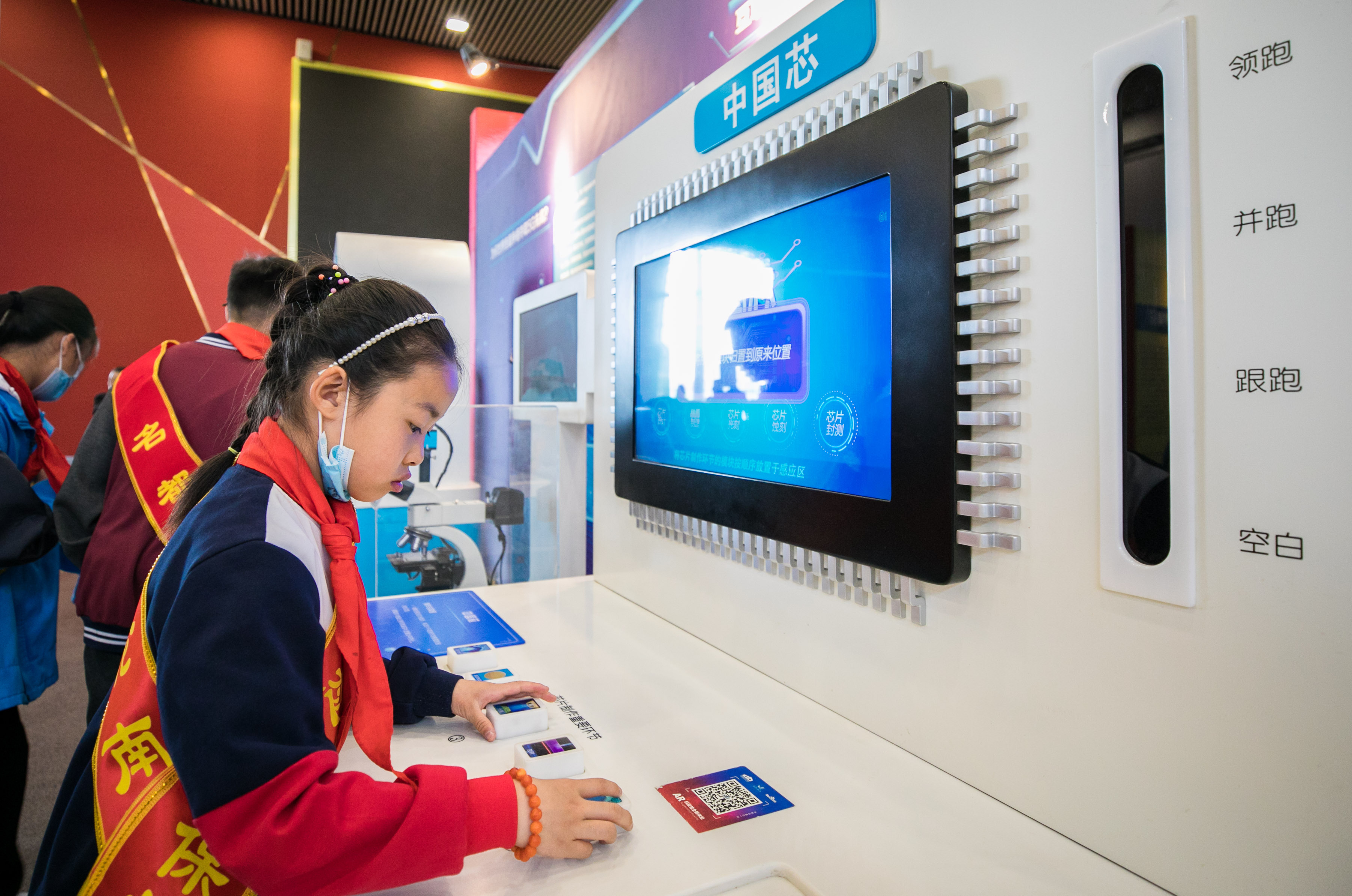 观众在内蒙古科技馆展厅内参观芯片制作重要环节模型。(摄影:丁根厚)