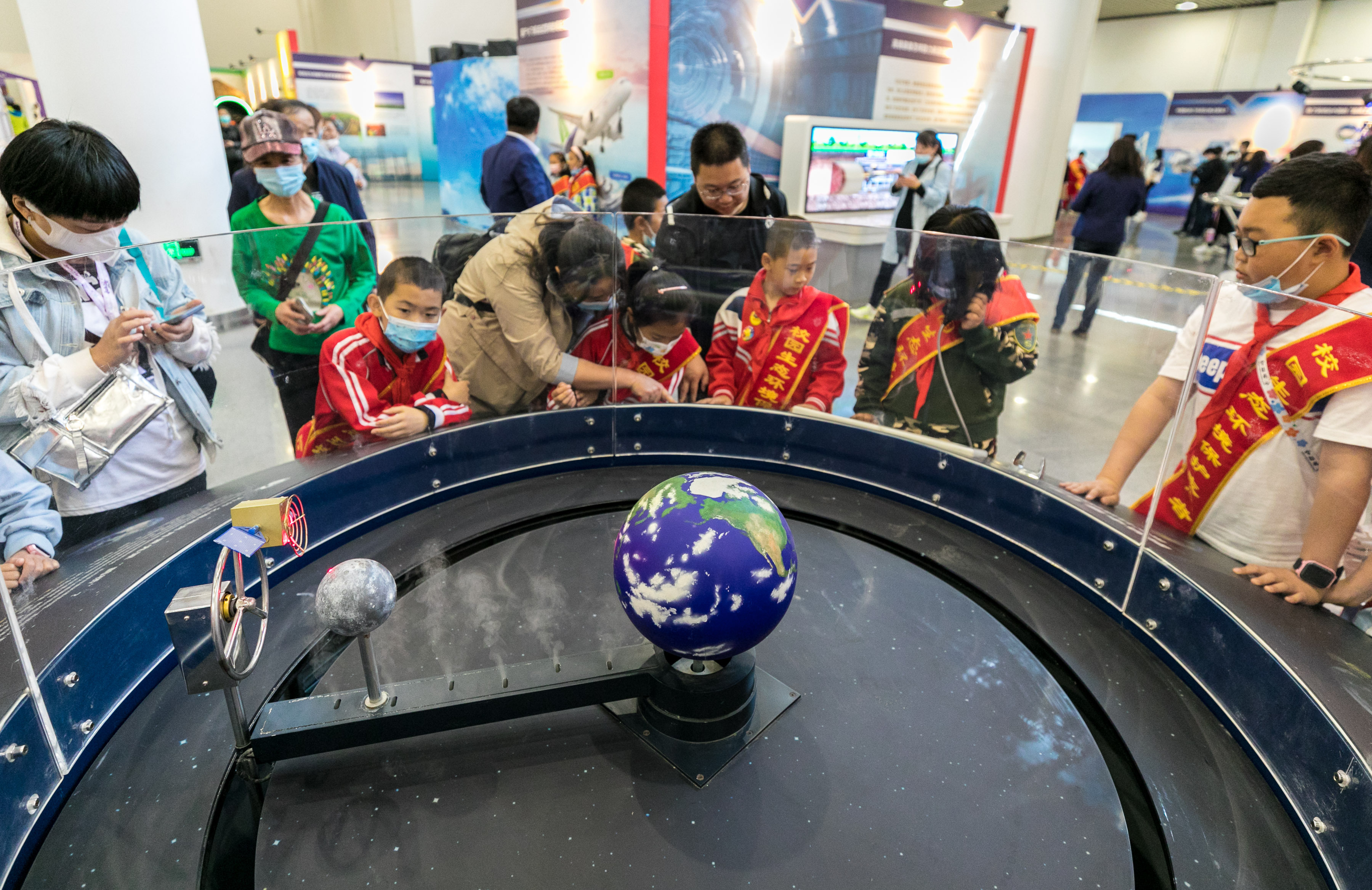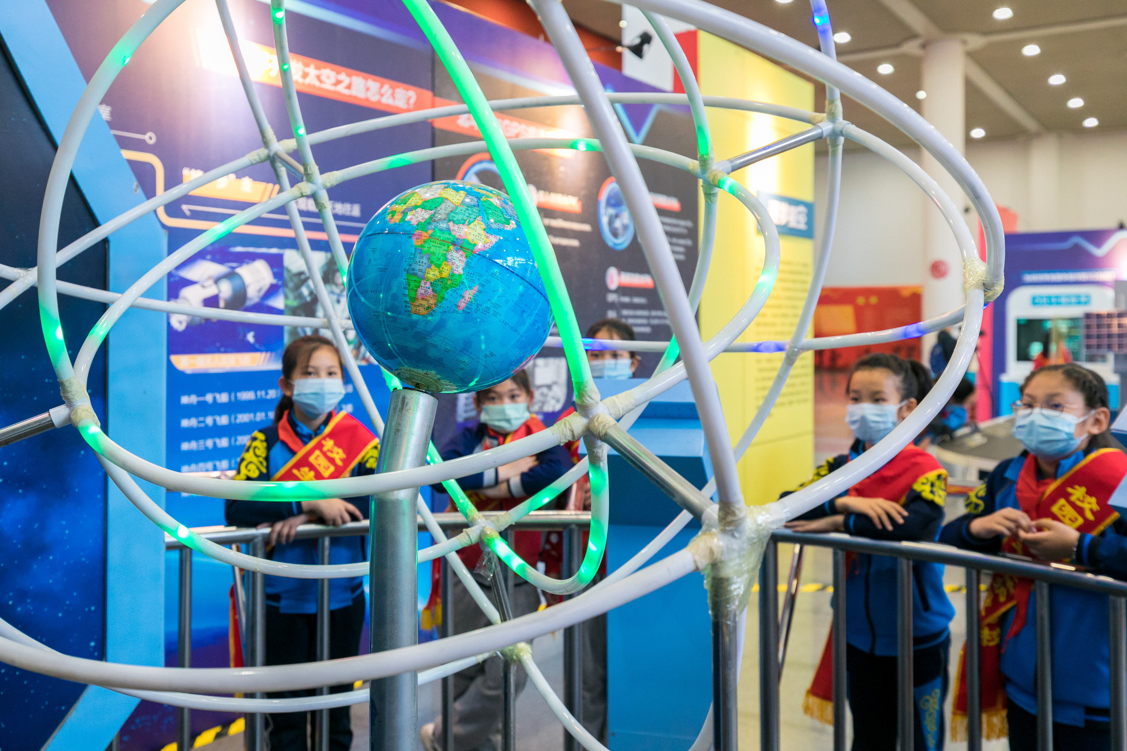 观众在内蒙古科技馆展厅内参观北斗全球卫星导航系统模型。(摄影:丁根厚)