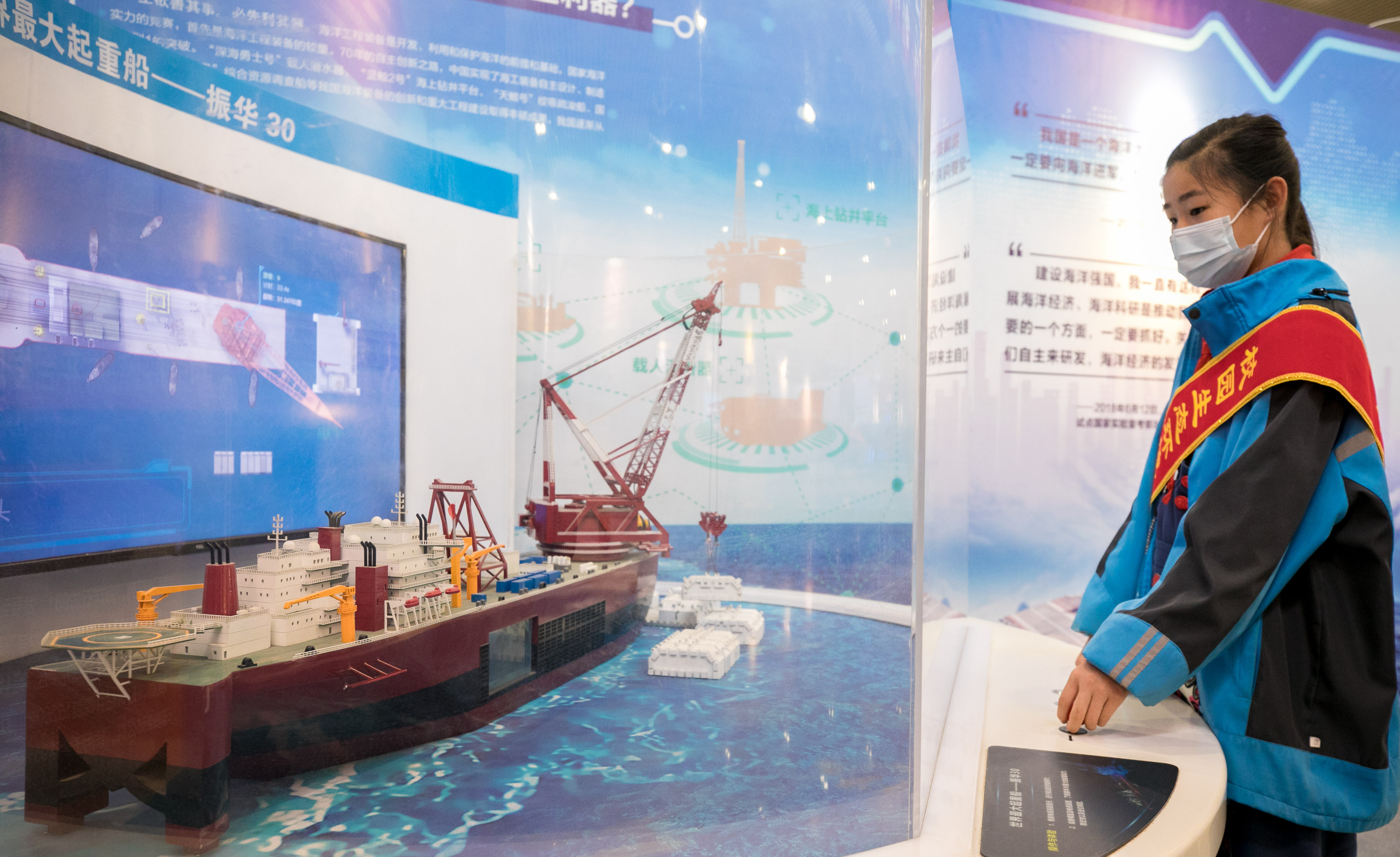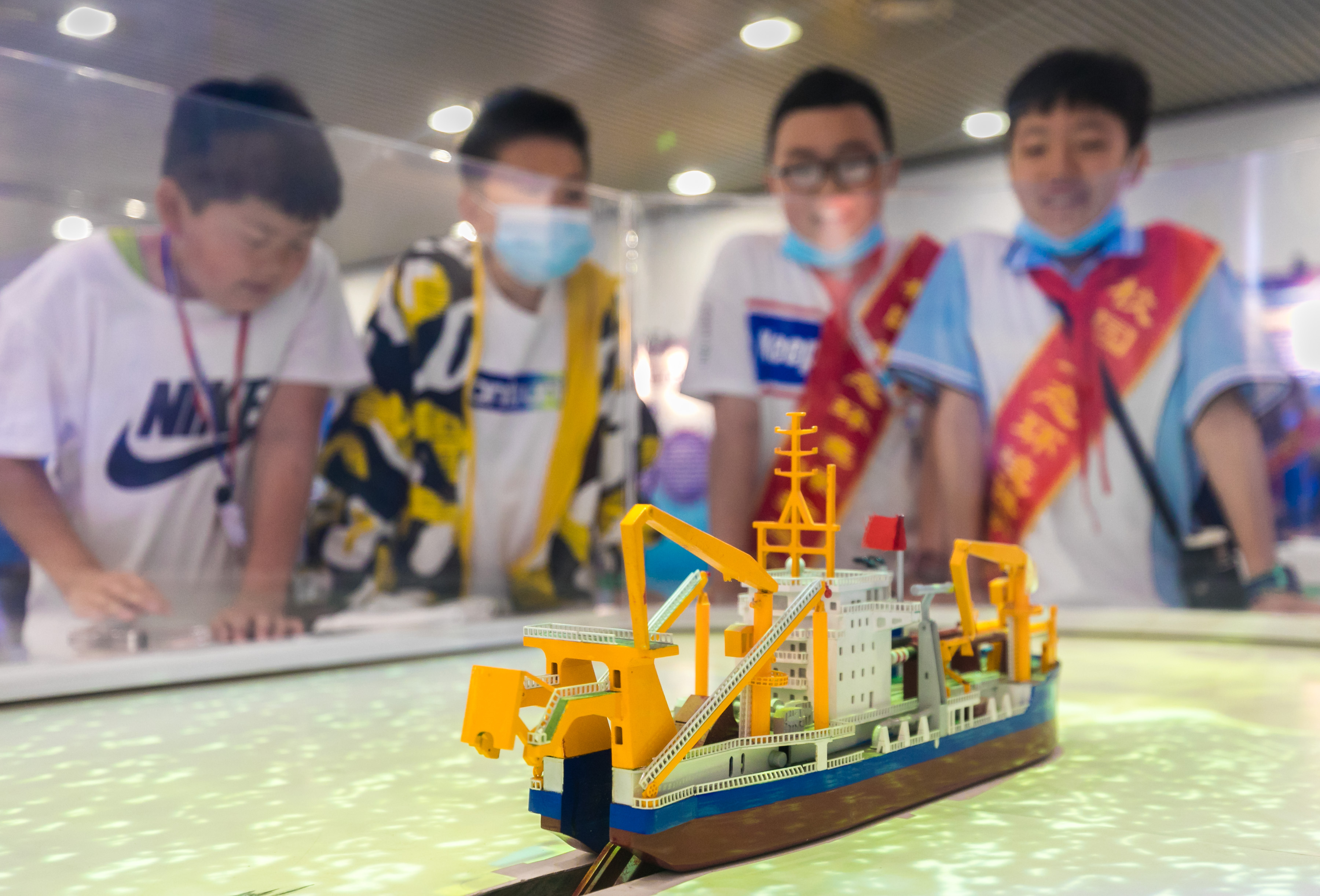 观众在内蒙古科技馆瀚海扬波展区参观世界最大起重船——振华30模型。(摄影:丁根厚)