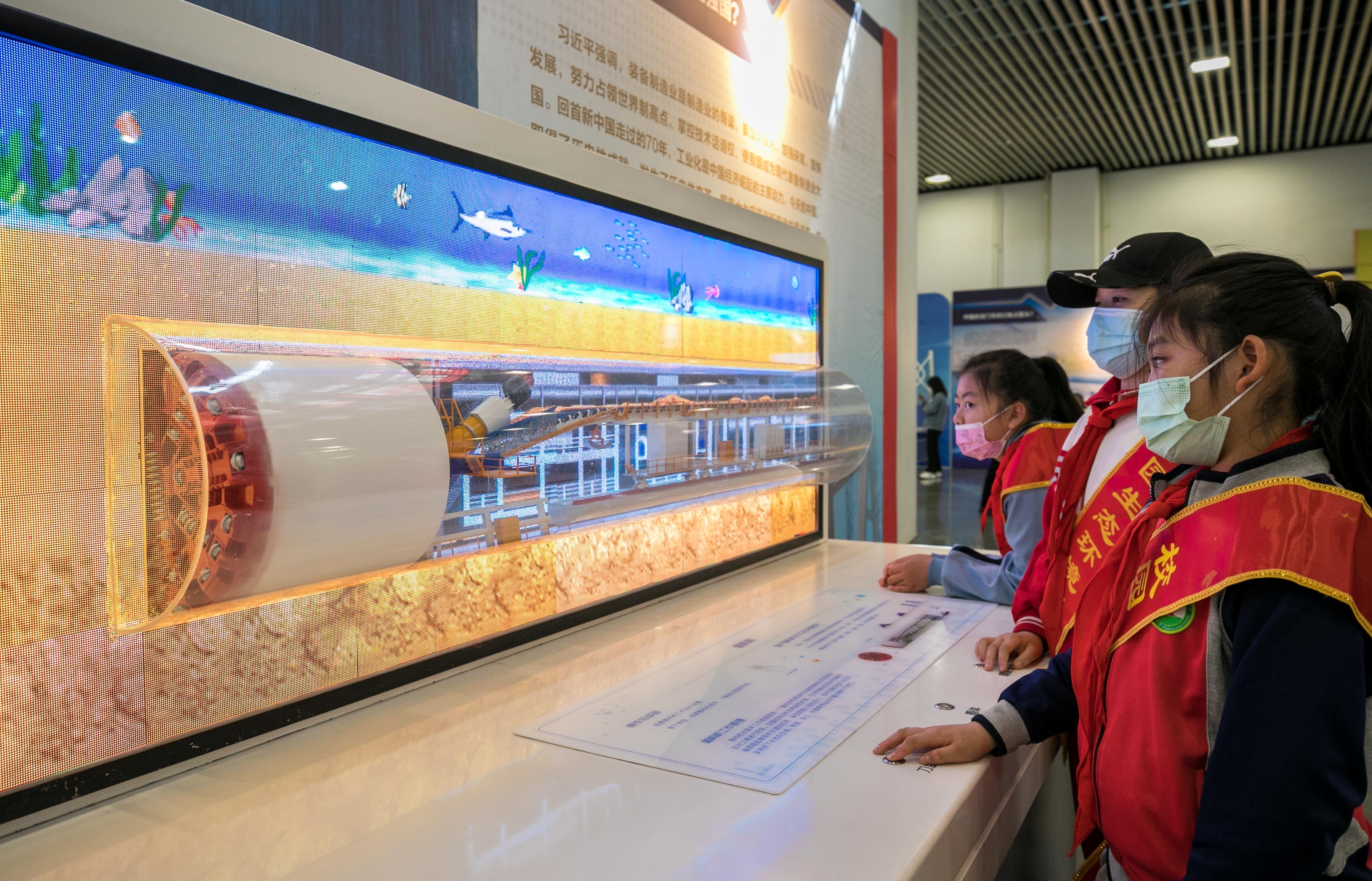 观众在内蒙古科技馆展厅内观看国产盾构机模型。(摄影:丁根厚)