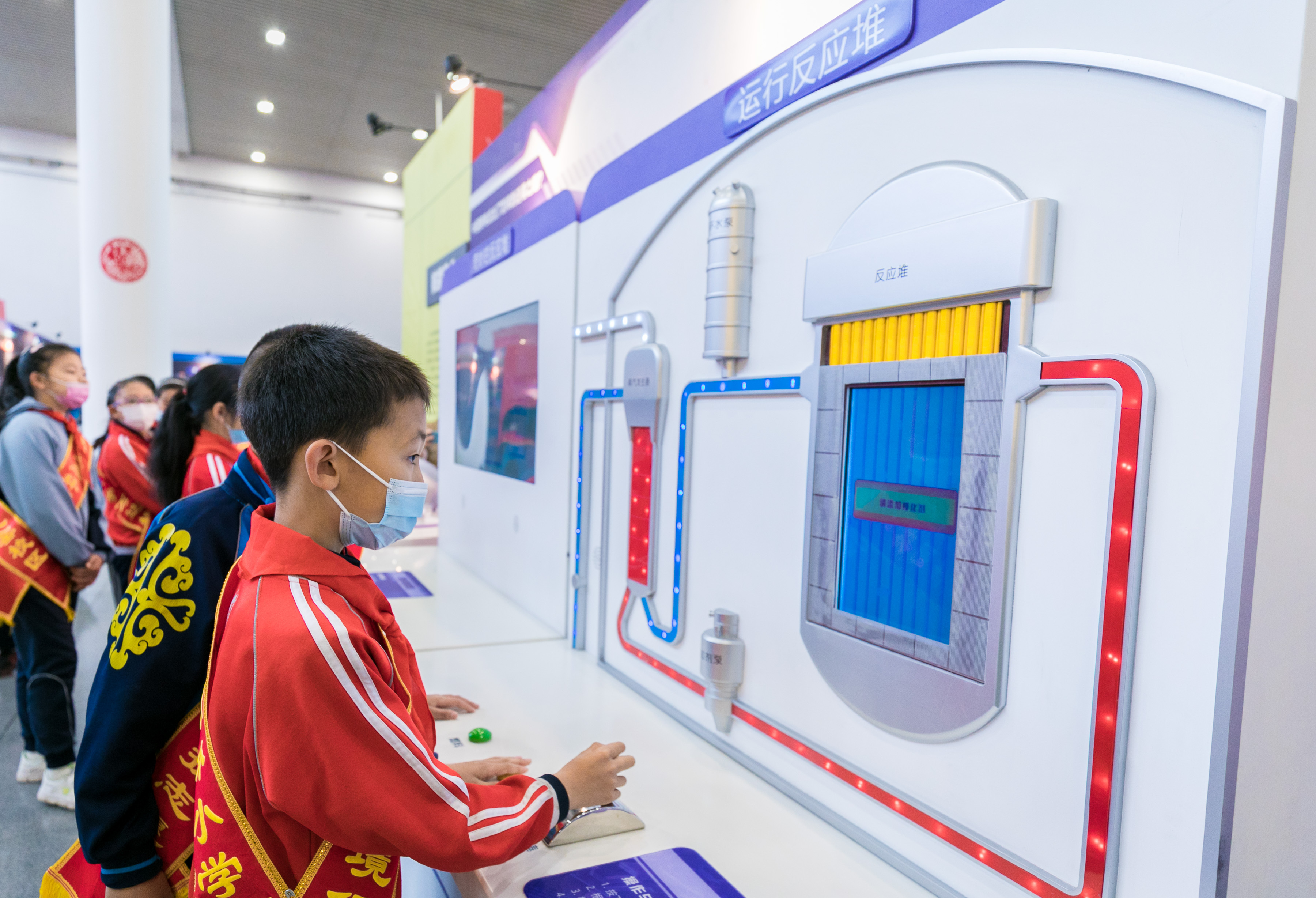 观众在内蒙古科技馆展厅内通过模型体验运行反应堆。(摄影:丁根厚)