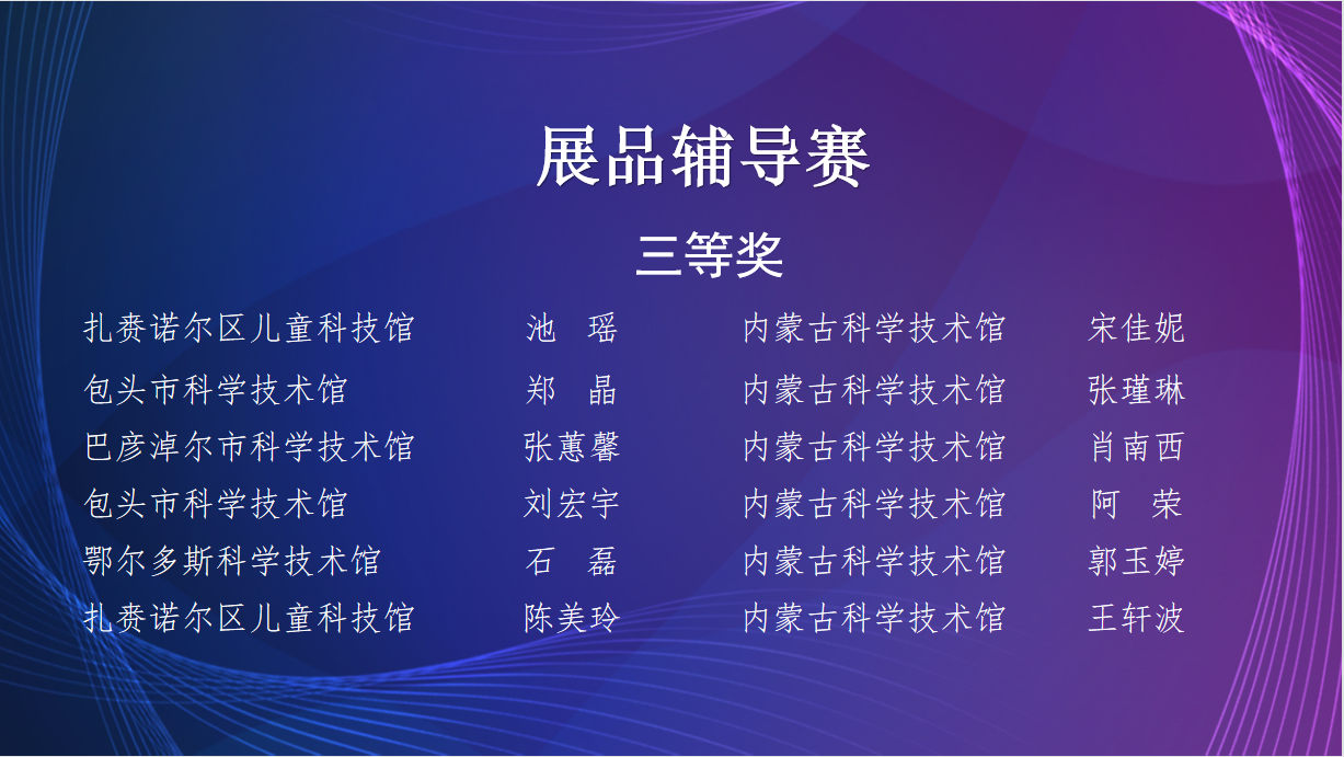 经过激烈角逐,来自内蒙古科技馆的王蕾、毛彦芳、马琳三名选手荣获本届科技辅导员大赛一等奖。各有12名选手分获大赛二等奖和三等奖。