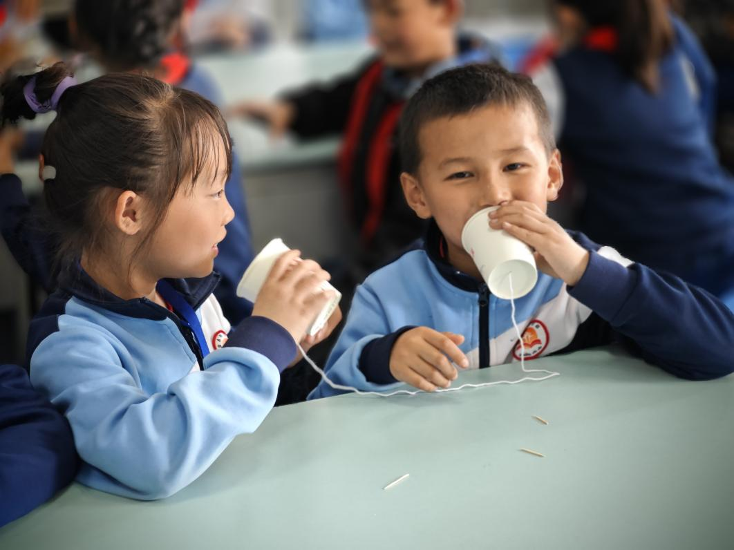活动中,学生们参加了科学课《声音的奥秘》。声音是如何产生的?声音可以在哪些介质中传播呢?带着问题,学生们制作“纸杯电话”,得出了声音源于物体的振动,声音可以在固体、液体、气体中传播。一支支“纸杯电话”不仅传播声音,更是承载了学生们对于科学的热爱和探索。