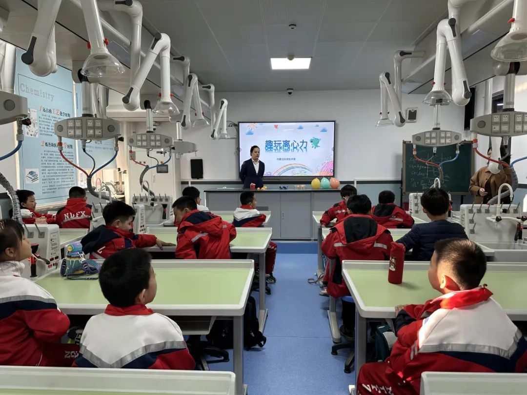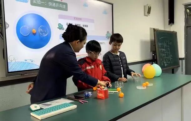 实验环节,学生们通过“快递乒乓球”“悬浮的水”“乒乓球坐电梯”等一系列趣味实验和互动体验,深入地了解了离心力的原理和应用,通过体验腕力球,亲身感受了离心现象。