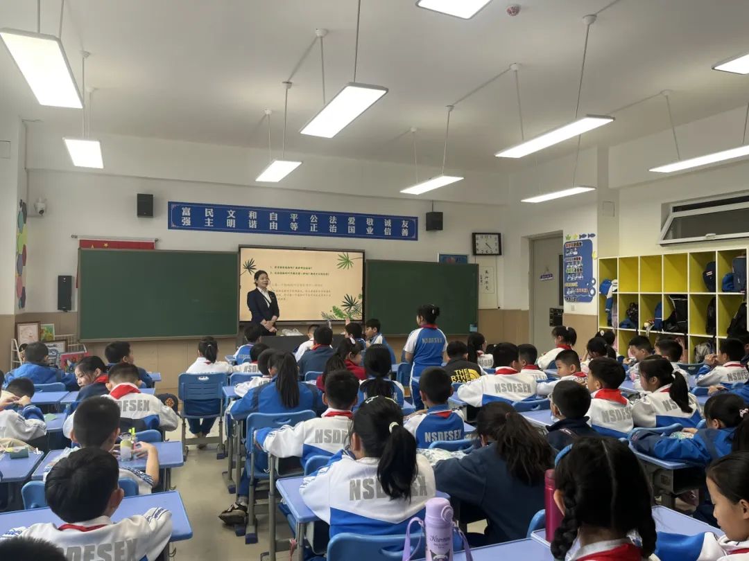 科学课《叶子真奇妙》,通过“猜叶”游戏,激发学生们探索叶形的兴趣。科技辅导员带领学生们观察多种植物的叶子标本,认识植物叶片的叶形、叶柄、叶脉等结构;最后利用绿萝叶片、滴管和载玻片等材料,制作叶子临时切片。让学生们学会运用Foldscope折叠显微镜观察叶片纵切结构,探索叶子的奇妙之处。在动手操作过程中,学生们不仅学会了如何去探究、解决问题,还学会了如何去合作、分享。