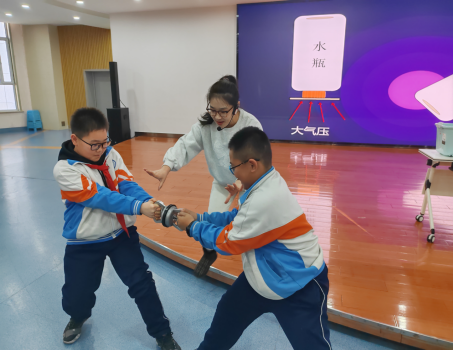 在“马德堡半球实验”中,同学们被分成若干小组,亲身参与到这场力气大比拼中。他们通过亲身实践,深刻感受到了压力差所带来的惊人能量。现场充满了欢声笑语和惊呼赞叹,气氛异常热烈。同学们积极参与实验互动,踊跃回答科技辅导员的提问,展现出了对科学探索的浓厚兴趣与无限热情。