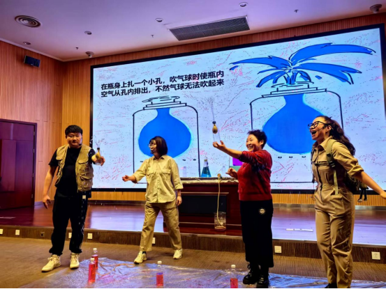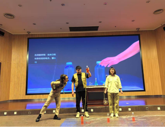 演出中,辅导员化身考察队,通过一系列生动有趣的自制喷泉实验,揭秘“王者喷泉”的奥秘。“普通的矿泉水瓶就可以做成喷泉?”观众带着疑问深入了解气压之谜。