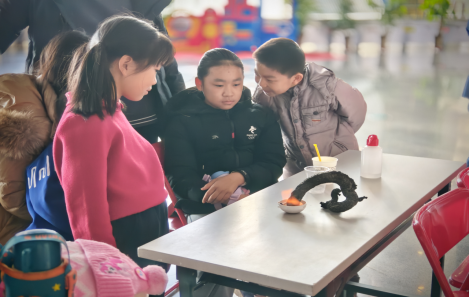 走进大厅,科学春节的氛围扑面而来。在科技辅导员的带领下,孩子们以白糖、小苏打为“笔”,绘就“法老之蛇”实验的奇妙画卷,依“小蛇”之形,巧手制蛇灯,化学的神奇此刻跃然纸上。