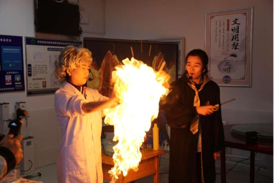 科学实验秀《魔法大挑战》融合科学、奇幻与竞技,从茶水变色到紫甘蓝汁酸碱指示,再到火龙卷视觉盛宴与火焰掌惊险表演,实验连连、目不暇接。高潮部分当属“火龙卷”和“火焰掌”实验,学生们现场见证了高锰酸钾与过氧化氢碰撞的实验效果,当跳跃的火焰在科技辅导员手中舞动时,他们的脸上瞬间绽放出兴奋的笑容。精彩的科学实验秀让学生们对奇妙的科学产生了浓厚的兴趣,体会到学中玩、玩中学的乐趣,并在心中埋下了探究科学的种子。