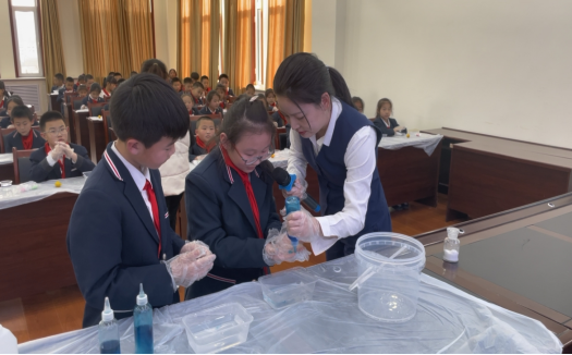 为了让同学们更加直观地了解硼的化合物--硼砂,科技辅导员带领大家利用硼砂和胶水,动手制作硼砂“拉丝秀”。随着硼砂与胶水的奇妙反应,原本流动的液体逐渐变成了富有弹性的固体。