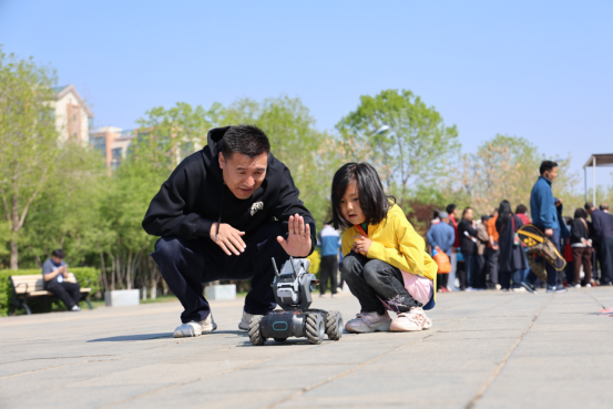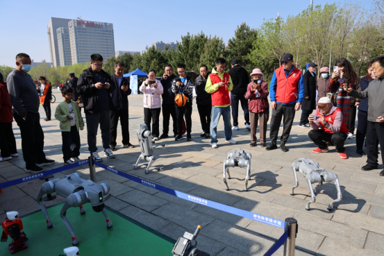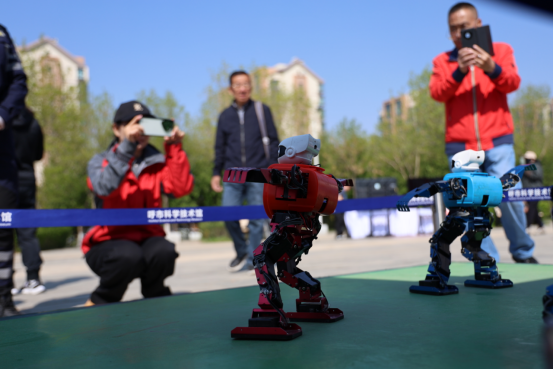 在科技展示区中央,内蒙古科技馆、呼市科技馆、新城区科协的三辆科普大篷车满载“椎体上滚”“动画”“梵天塔”等20多套互动展品一字排开,带来多样体验。智能机器狗成为全场的焦点,随着指令下达,机器狗灵活地完成行走、奔跑、翻滚等高难度动作,甚至能根据手势或语音指令与观众握手、转圈,现场充满欢笑声与科技探索的热情。人形机器人随着音乐跳出流畅的机械舞步,关节转动与音乐节拍完美契合,观众纷纷举起手机记录。一场名为《隐形大力士》的科学表演,通过戏剧化演绎大气压强原理,让在场观众亲历“空气捏扁水桶”“气流托举钢铁”等奇幻场景。