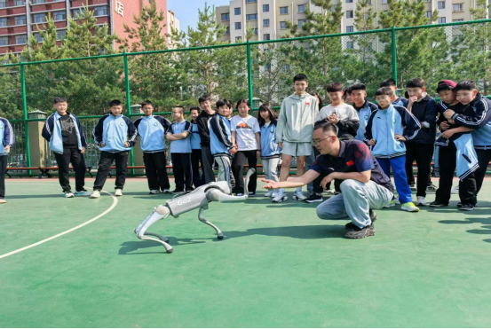 “快看!机器狗会后空翻!”随着欢呼声,机器狗在操场上灵巧穿梭,时而奔跑跳跃,时而完成高难度侧空翻。同学们围成一圈,兴奋地跟着节奏拍手,有的还忍不住跟着机器狗做握手动作。“原来科技这么有趣!以后我也要研究这些机器人。”长跑队的同学边说边用手机记录下精彩瞬间。