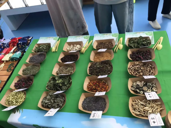 随后,老师准备了艾叶、菖蒲、丁香等具有驱疫避秽寓意的传统香草药材以及各色布料、彩绳和针线。在老师的指导下,参与活动的家庭纷纷化身“巧手匠人”,穿针引线、填充药草,精心缝制属于自己的端午香囊。