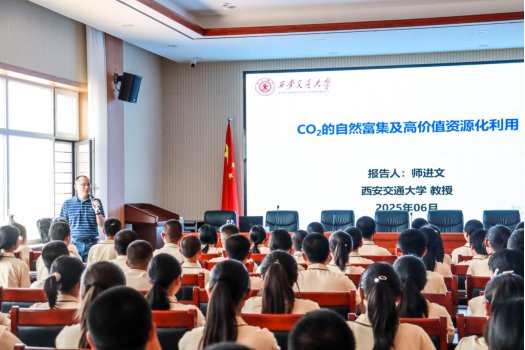 西安交通大学绿色氢电全国重点实验室教授、博士生导师师进文带来一场题为《CO₂的自然富集及高价值资源化利用》的专题报告。师进文教授以西安交通大学服务国家战略的使命担当开篇,将“胸怀大局”的西迁精神与当今“双碳”科技攻关紧密联结。面对求知若渴的学生,师进文教授化身“碳科学向导”,用鲜活案例破解复杂原理,配合动画演示和科研实景图片,抽象的实验室成果变得直观可感,同学们神情专注,眼中闪烁着对绿色科技的向往。