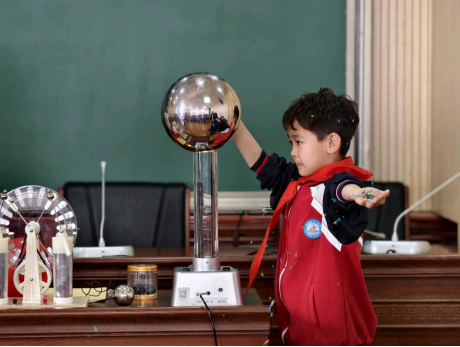 报告厅变身奇幻科学剧场。科学实验秀《魔法大挑战》中,液氮制造的“腾云驾雾”、超导磁悬浮的“隔空取物”,让日常物品焕发神奇魅力;《静电魔法秀》里,“怒发冲冠”的滑稽场景、指尖跃动的电光火花,将抽象物理原理化作视觉奇观。科技辅导员化身“魔法师”,用幽默语言拆解现象背后的电磁学、热力学知识,在笑声与掌声的交织中,丰富的科学知识悄然浸润了学生们的心田。