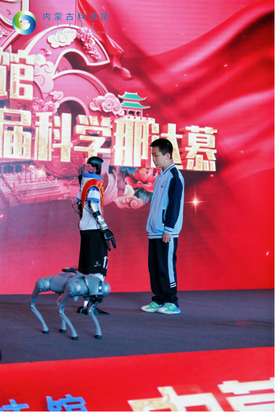 主舞台文艺展演同样亮点满满。呼和浩特市第三十中学的合唱《玉盘》《红领巾相约中国》童声清亮,满是温情与志向;师范大学附属云谷中学的机器狗表演《文明小使者的上学路》,机器狗们跟着音乐“走秀”,把人工智能玩出了新花样;呼和浩特市建华学校的情景剧《AI时代未来我们》,更是带领观众畅想科技未来。