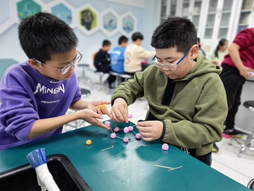理论学习之后,课程进入到最受欢迎的制作环节。在科技辅导员的耐心指导下,同学们化身“小小科学家”,用五颜六色的超轻黏土代表碳、氢、氧等不同原子,以牙签模拟原子间的作用力,从确定原子位置到确定分子结构,互相帮助、精心组合。当一个个专属可燃冰分子结构模型完成时,同学们的脸上洋溢着满满的成就感,在实践中加深对科学原理的理解。