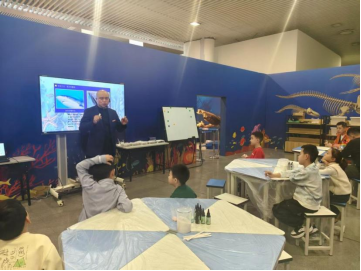 活动期间,内蒙古科技馆的科技辅导员在研学教室同步开展生动有趣的海洋科普教育活动《海洋巨兽——鲸鱼》。在这里,孩子们从被动聆听的“观众”,化身为主动探索的“小小科学家”,在趣味科学实验和创意动手制作中巩固所学知识、解锁海洋科学的神秘面纱。