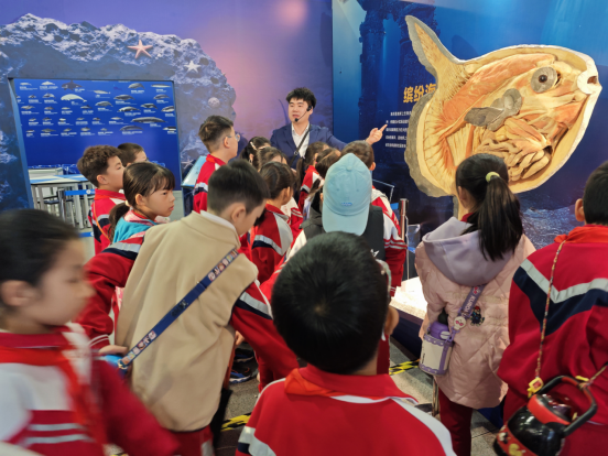 随后,学生们在《海洋精灵》专题展研学教室参与了科学课《“鳍”妙演化》。课堂上,科技辅导员以“从鱼到人的演化过程中,身体结构需要经历哪些变化”为切入点,与学生们展开讨论,带领大家穿越时空,探究鱼鳍的形态演变与演化脉络。在轻松热烈的交流氛围中,学生们不仅系统了解了鱼类适应环境的生存智慧,更在思辨与探究中锻炼了科学思维。