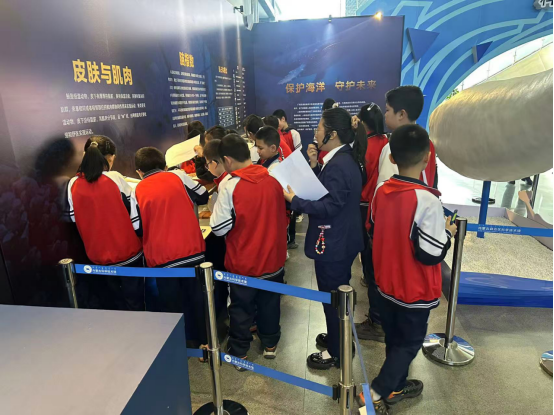 走进内蒙古科技馆,学生们满怀好奇与憧憬,开启了奇妙的海洋探索之旅。在《海洋精灵》主题展厅,形态各异的海洋生物标本、详实生动的科普图文展板、趣味十足的互动体验装置,全方位勾勒出神秘浩瀚的海洋世界。从日常熟知的硬骨鱼到叱咤海洋数亿年的鲨鱼;从外形酷似鱼类、实则为哺乳动物的鲸豚类到憨态可掬的鳍足动物,每一种生物都让学生们驻足观赏。大家认真聆听科技辅导员的细致讲解,结合“学习单”仔细观察、用心记录,深入了解不同海洋生物的生活习性、生存特征及海洋生态保护知识。在沉浸式参观体验中,学生们真切领略海洋生物的灵动之美,在心底种下探索海洋奥秘、守护蔚蓝家园的种子。