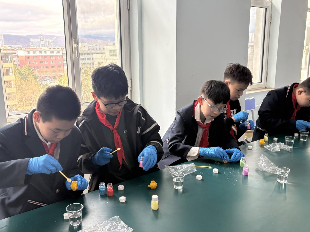 令人兴奋的硼砂“拉丝秀”实验重磅登场,将课堂氛围推向高潮。科技辅导员将液体胶水与硼砂溶液混合,两者发生奇妙的交联反应,原本流动的液体逐渐凝聚成富有弹性的固态胶体。同学们跃跃欲试,纷纷举手参与实验,切身感受化学变化的奇妙。