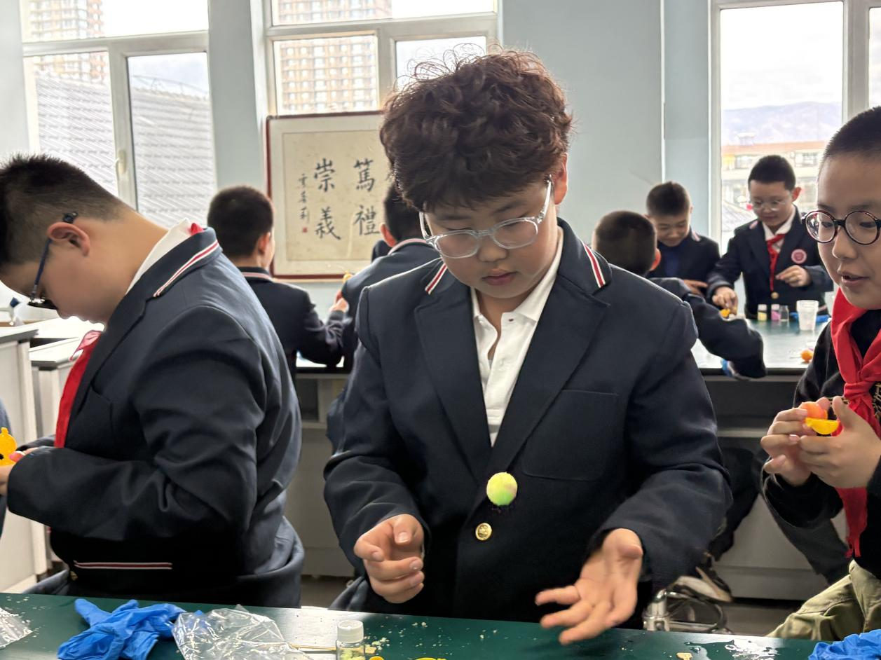 课程伊始,科技辅导员为同学们分发了制作弹力球的材料,现场演示操作步骤并详细讲解注意事项。五颜六色的实验材料瞬间吸引了同学们的目光,大家纷纷化身“小小化学家”,兴致勃勃地跟着实验步骤动手操作。基础操作完成后,同学们将球型模具小心放入水中,屏息凝神、满怀期待地守候,等待弹力球在固化过程中完成神奇的“蜕变”,整个教室充满了对科学探索的热切与憧憬。