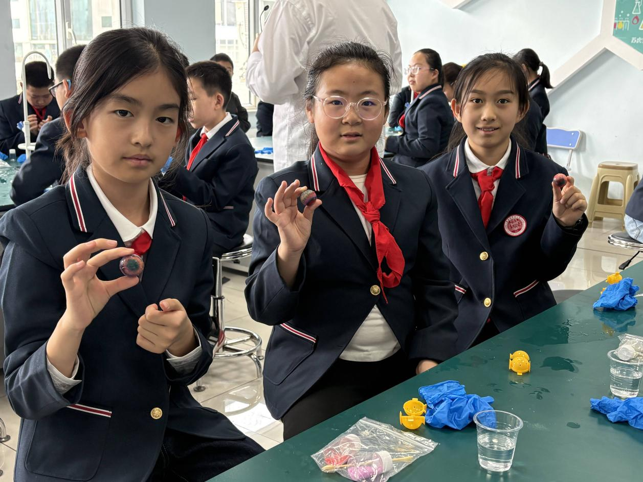 课程接近尾声,最令人期待的“拆模具”环节中,同学们小心翼翼地打开放置许久的球形模具,一颗颗五彩斑斓、圆润饱满的弹力球映入眼帘。“我的弹力球是蓝色的,太好看啦!”“快看,我的是彩虹渐变色!”大家兴奋地举起自己制作的弹力球,分享成果、交流感受,脸上洋溢着满满的成就感与喜悦。