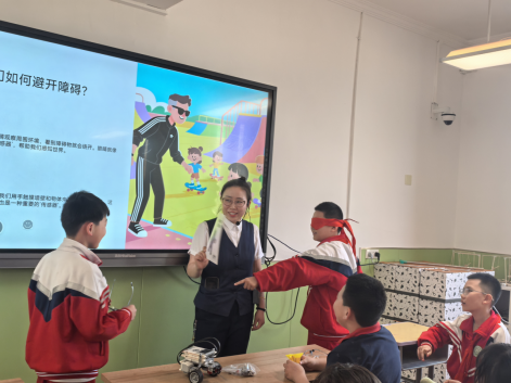 实操环节趣味十足、互动满满。同学们分组参与“盲人辨位”与声波反射实验,蒙眼拍手感知回声、辨别方位,沉浸式体验声波反射的奇妙原理;再用手电筒照射不同材质卡纸,直观观察光线反射的强弱差异,动手验证红外感知的科学逻辑。随后的模拟机器人编程环节,同学们化身“小小工程师”,用简易指令模拟机器人感知环境、躲避障碍、识别悬崖的全过程。当编程操控的小车灵活转向、平稳停靠时,现场惊叹声与欢呼声不断。