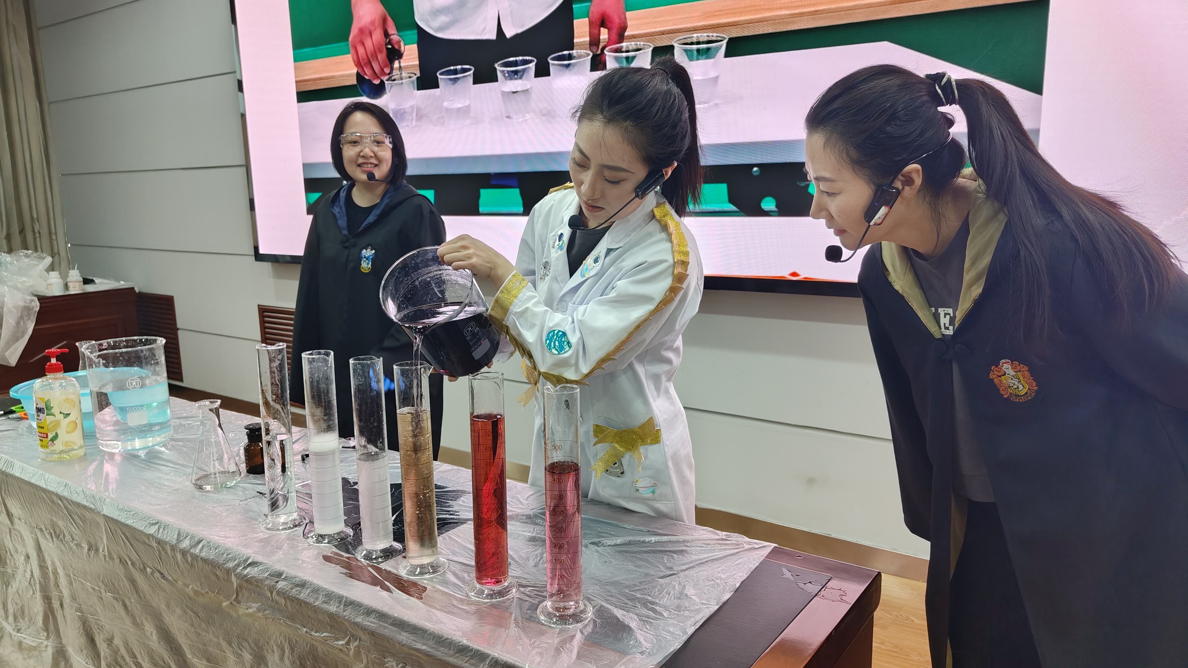 本次科普活动将抽象的科学原理与趣味实验相融合。科技辅导员们通过精准的试剂配比、规范的实验操作,展示了多项科学实验:气流喷射呈现力学现象,液体变色展示化学反应的奥秘,兼具观赏性与科学性的实验轮番登场,直观呈现科学原理的奇妙。